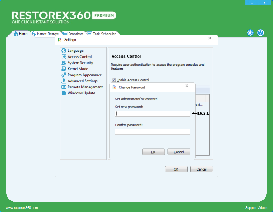 6.2. Access Control 16.2 Access Control – To enable Access Control, click on "Enable Access Control." 16.2.1 – Enter your desired password, re-enter it in the "Confirm Password" field, and click OK. Click OK again to confirm.