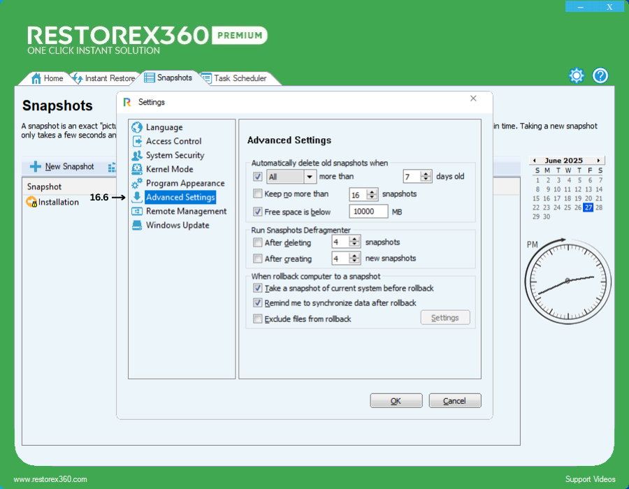 The Advanced Settings section allows you to fine-tune RestoreX360’s snapshot management and system rollback behavior to optimize performance, storage utilization, and data integrity according to your specific needs.