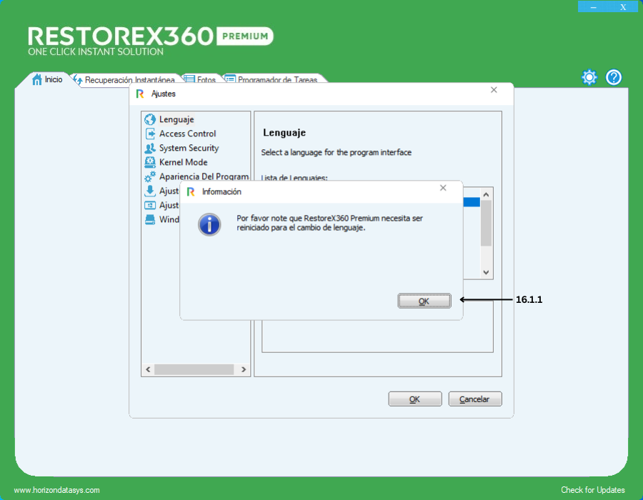 Click OK, then click OK again in the Language Selection dialog. Once confirmed, close the RestoreX360 software and reopen it.