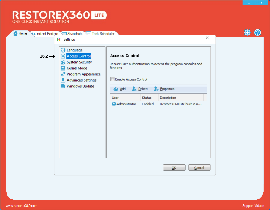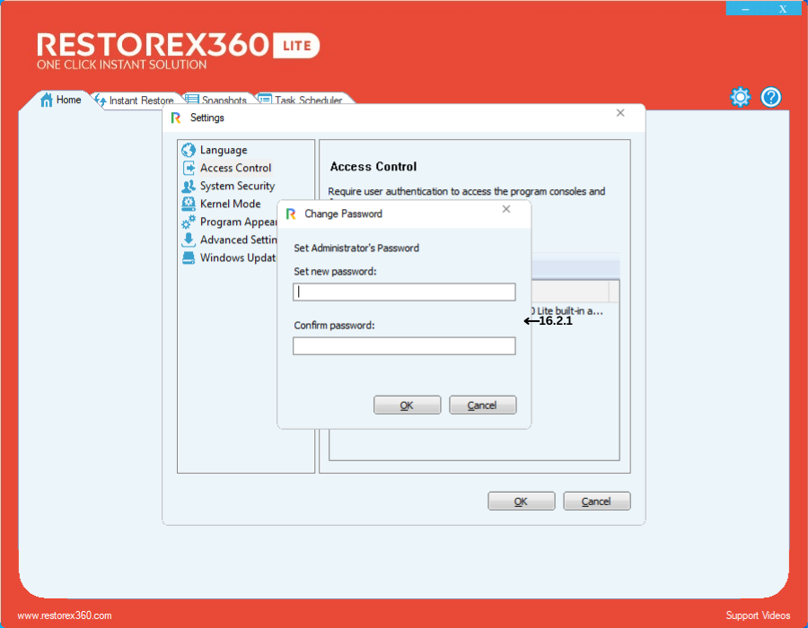 6.2. Access Control 16.2 Access Control - To enable Access Control, click on "Enable Access Control." 16.2.1 - Enter your desired password, re-enter it in the "Confirm Password" field, and click OK. Click OK again to confirm.