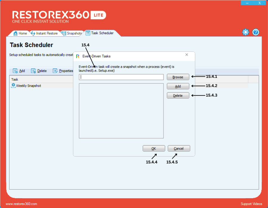 You can configure RestoreX360 to automatically create a snapshot whenever a specific executable file (e.g., setup.exe, installer.exe, etc.) is launched. This ensures system protection before any installation or process begins.