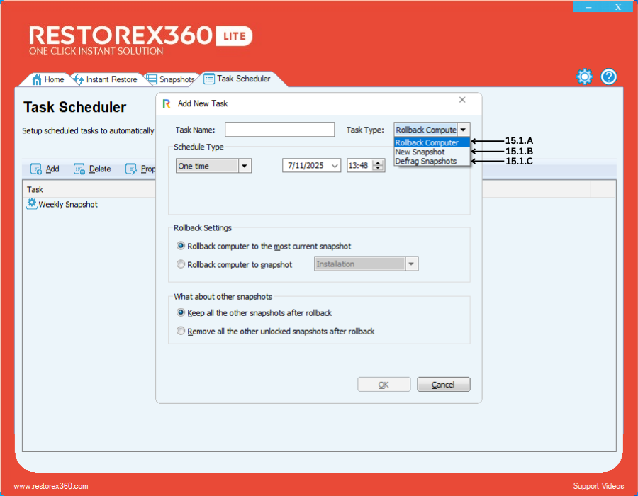 b. Rollback computer to selected snapshot - Manually select a specific snapshot to roll back to.