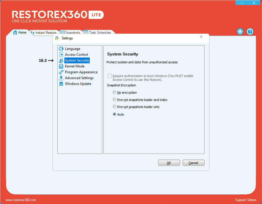 Note: When you choose the Auto option, RestoreX360 intelligently determines the optimal encryption method to balance security and system performance.