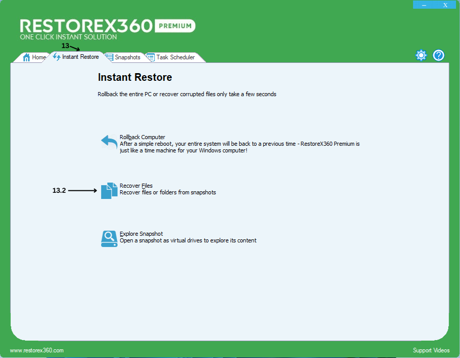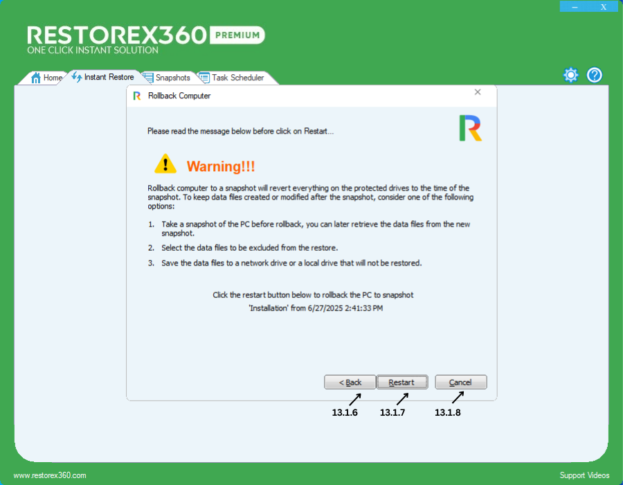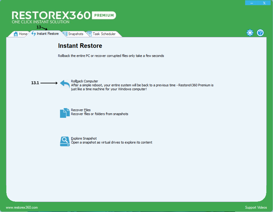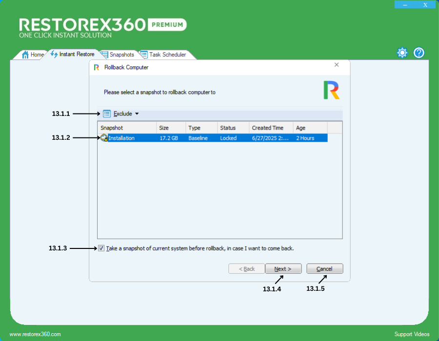 To roll back your computer using RestoreX360 Premium, follow these steps: