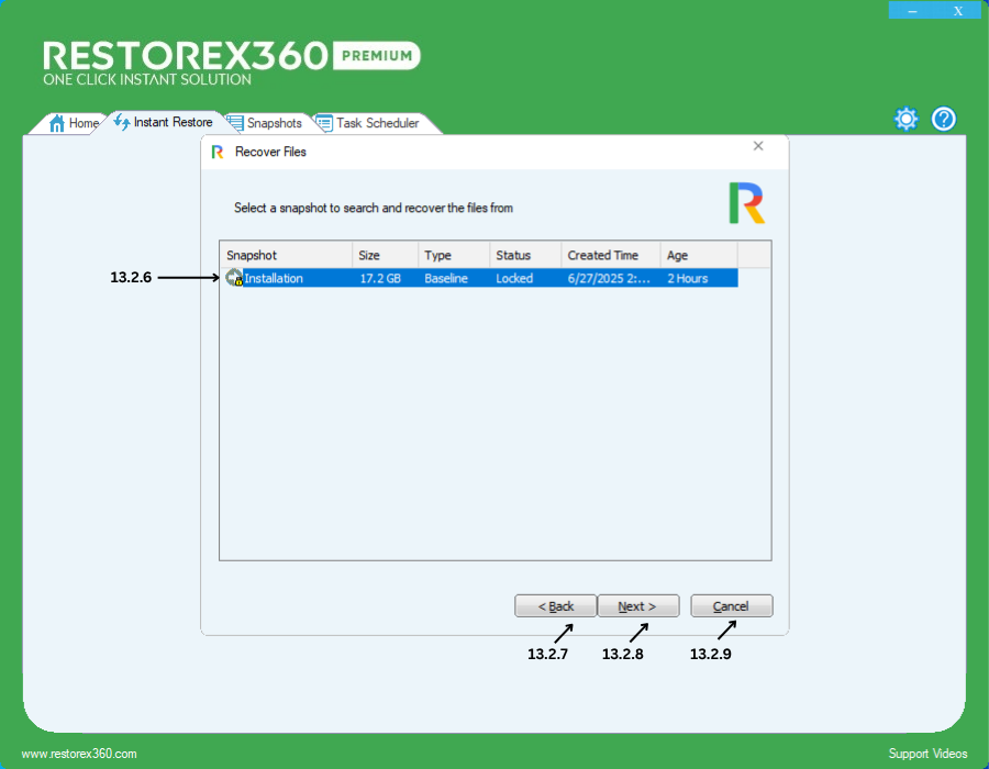 13.2.6 - Select a snapshot in which you remember the specific file or folder was available. Use the date and time to help identify the correct snapshot.