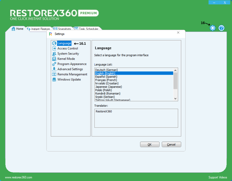 Click OK, then click OK again in the Language Selection dialog. Once confirmed, close the RestoreX360 software and reopen it.