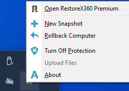 When RestoreX360 Premium is installed and running, its icon appears in the Windows taskbar (system tray). Right-clicking or clicking on this icon opens a context menu that gives you quick access to several core features. Here’s what each item does: